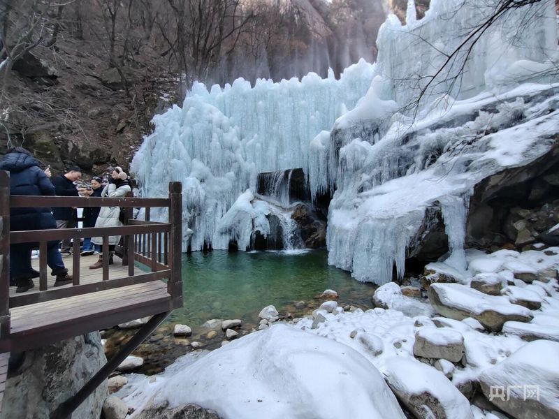 “这冰瀑布从山上倾泻而下,太壮观了!”1月16日,游客王女士在太白山景区莲花峰处一边拍照打卡一边感叹。
