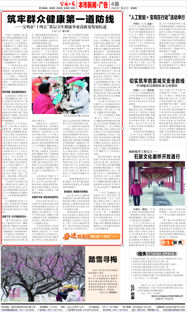 “十四五”圆满收官,宝鸡基层卫生工作者交出了亮眼答卷。展望“十五五”,更多暖心举措正在路上:通过卫生强基工程,实施基层医疗机构基础设施和设备配置升级计划,推动社区卫生服务中心向“一老一小”健康服务转型,推动县级医院与基层医疗机构资源共享、人才下沉……这些硬举措将成为持续提升群众健康获得感的关键密码,让高质量发展的民生底色更暖更亮。