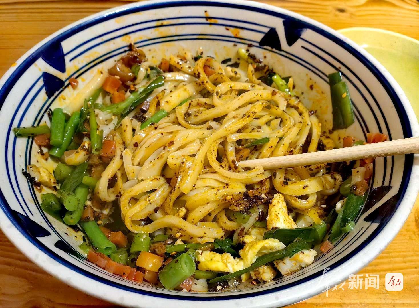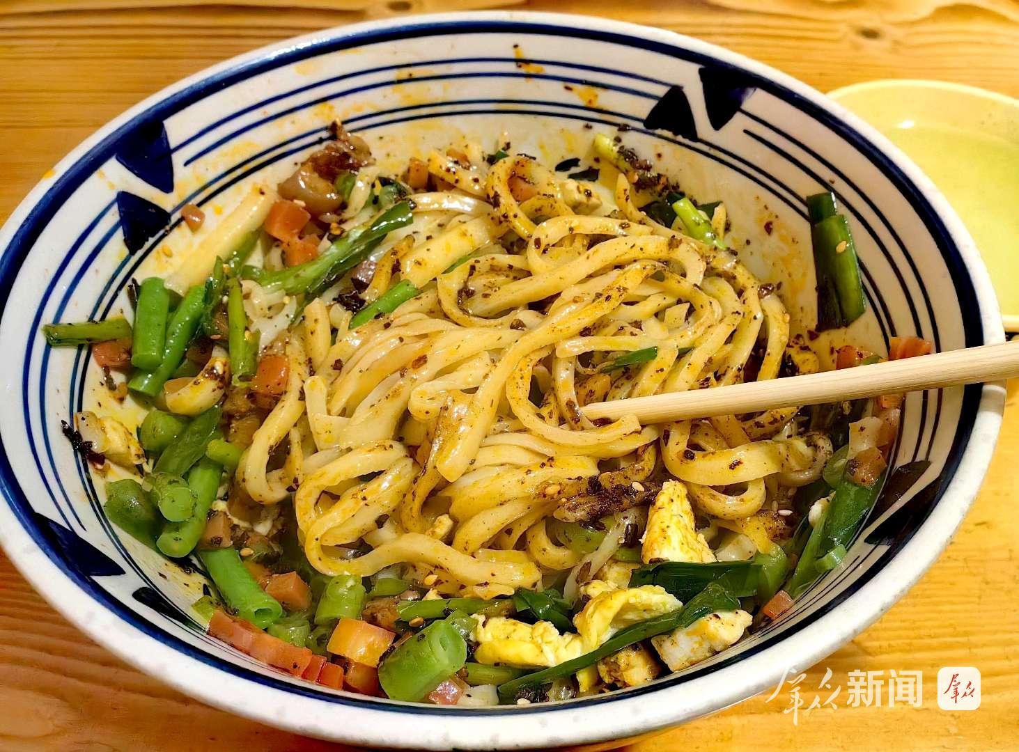老板麻利地端上一碗热气腾腾的削筋面,宽薄劲道的面条上,铺着嫩绿的韭菜、脆爽的豇豆,还有油亮亮的肉末臊子。舀一勺关中独有的油辣子拌进去,红亮的色泽瞬间裹满每一根面条,香气直钻鼻腔。拌匀后挑起一筷子,酸辣鲜香的滋味在舌尖炸开,熨帖了胃,也驱散了冬日的寒意。