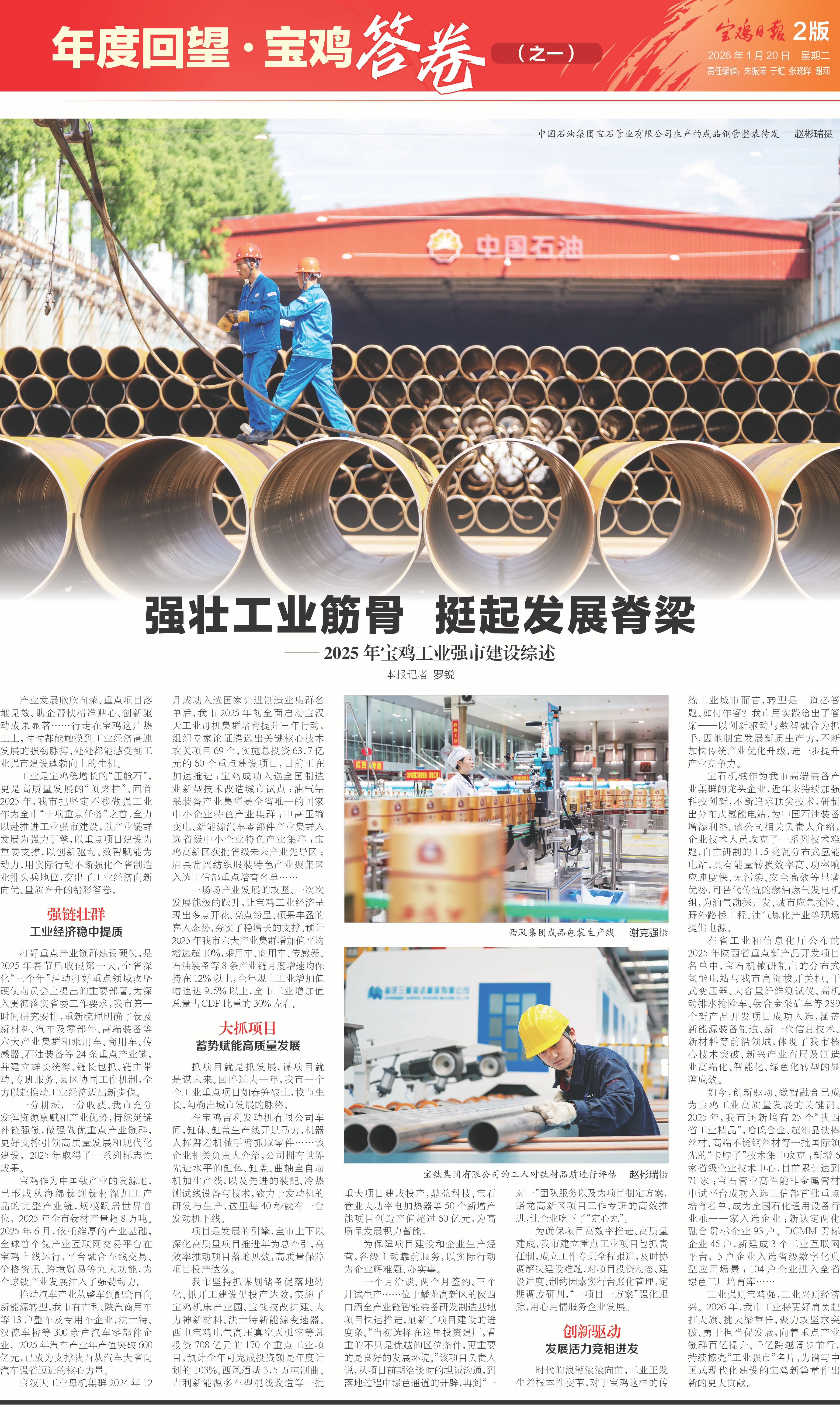 工业强则宝鸡强,工业兴则经济兴。2026年,我市工业将更好肩负起扛大旗、挑大梁重任,聚力攻坚求突破、勇于担当促发展,向着重点产业链群百亿提升、千亿跨越阔步前行,持续擦亮“工业强市”名片,为谱写中国式现代化建设的宝鸡新篇章作出新的更大贡献。(宝鸡融媒 罗锐)