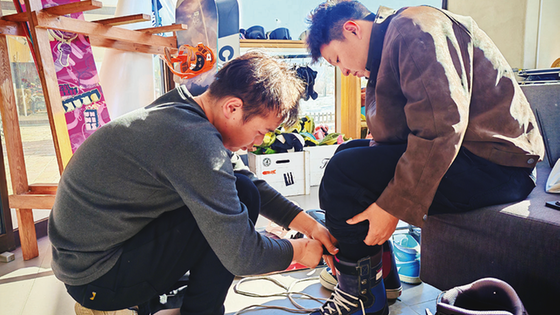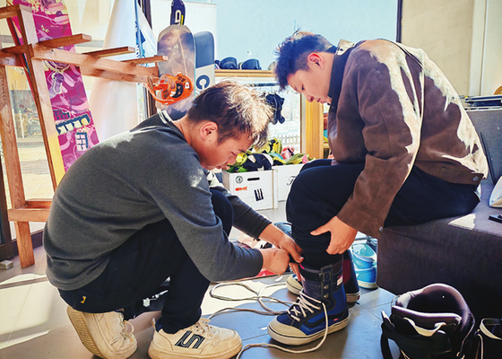 贾颜同帮游客试雪具