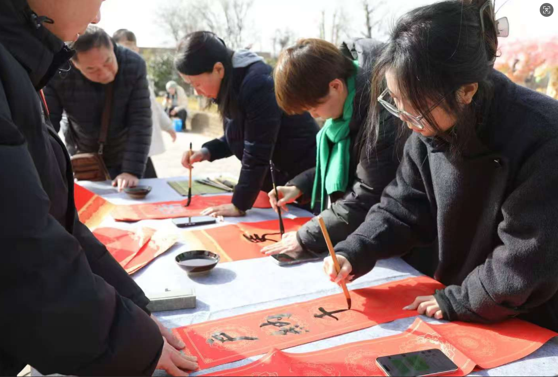 游客们有序等候,精心挑选心仪联句,或特邀老师现场定制专属新春寄语。一纸手写春联,不仅是新春佳礼,更是传统文化的鲜活传承,承载着最质朴温暖的新年祝愿,为周原故里添上了一抹厚重又鲜活的年味底色。