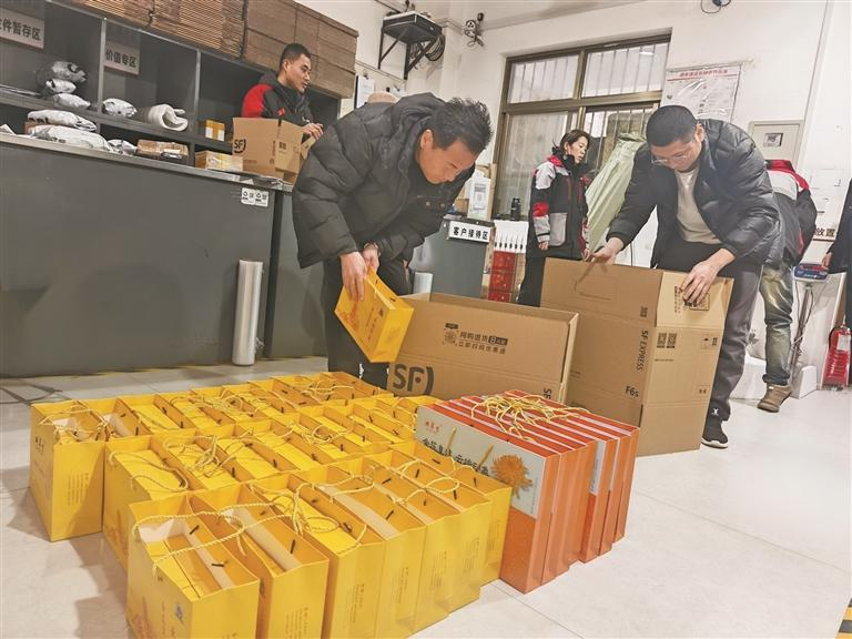 该公司车间内,10余名工作人员身着红色工作服,忙着将产自本地的土蜂蜜、核桃油、辣椒酱等农特产品装进礼盒。筛选分拣、预包装、贴标签、装箱封盒……他们分工协作,高效有序。