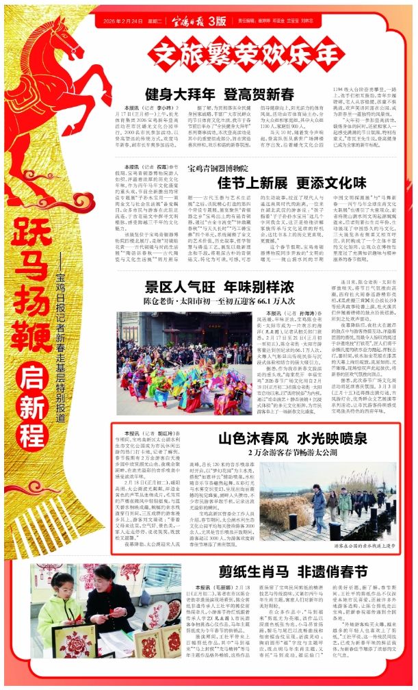 (宝鸡融媒 胡红玲)春节期间,宝鸡高新区太公湖水利生态文化公园成为市民休闲出游的热门打卡地。记者了解到,春节假期有2万余游客白天漫步园中欣赏湖光山色,夜晚会聚湖畔,在流光溢彩的音乐喷泉中感受浓浓年味。