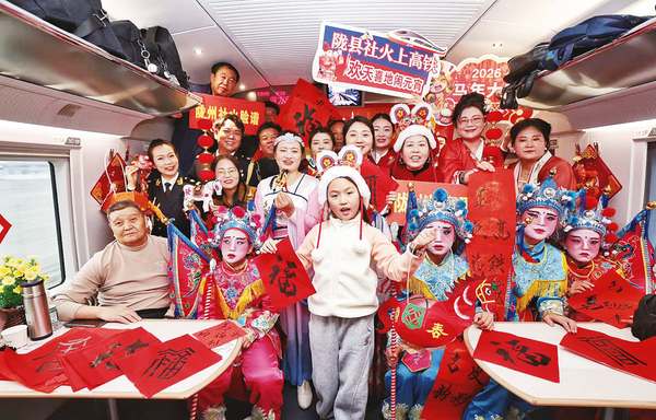 当天,行进中的C8916次列车车厢内张灯结彩,行李架两端悬挂的皮影与车窗上张贴的窗花相映成趣,一步一景皆是陇县民俗的独特韵味。列车启动后,演员们化身穆桂英、关公、花木兰等戏曲经典人物,高亢有力的嗓音、目光如炬的眼神,赢来阵阵喝彩。随后,陇州变脸、小调、剪纸、刺绣等一一亮相,让旅客直观感受别具一格的陇州风情。“没想到在高铁上还能看到地道的陇州社火,这趟出行让人难忘!”前往延安欢度元宵节的旅客赵女士一边举着手机拍摄,一边赞叹。