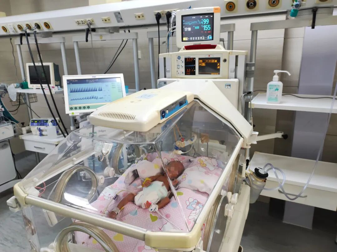 王先生的孩子一出生就出现严重呼吸困难,被确诊为极早产儿、极低体重儿,同时还伴有呼吸衰竭、重症肺炎、重度窒息等多项严重病症,身体状况极差。医护人员第一时间展开紧急抢救,气管插管、呼吸机辅助通气,全力维持孩子的生命体征。雪上加霜的是,进一步检查和诊断出十二指肠梗阻的结果让整个医疗团队和家长都揪紧了心。