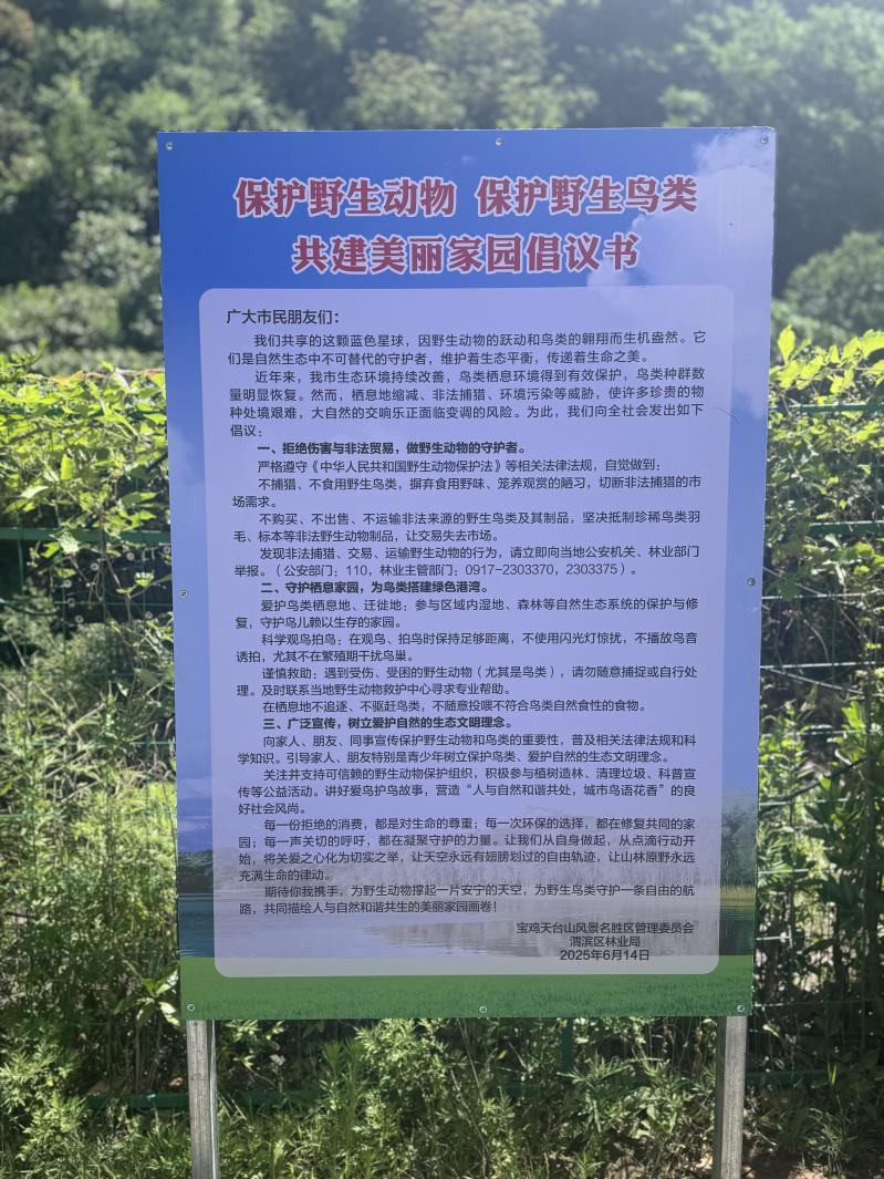 为增强公众爱鸟护鸟意识,宝鸡天台山管委会在景区及重点路段开展了一系列爱鸟护鸟宣传活动,向游客及当地居民普及野生鸟类保护知识,共同筑牢生态安全屏障。
