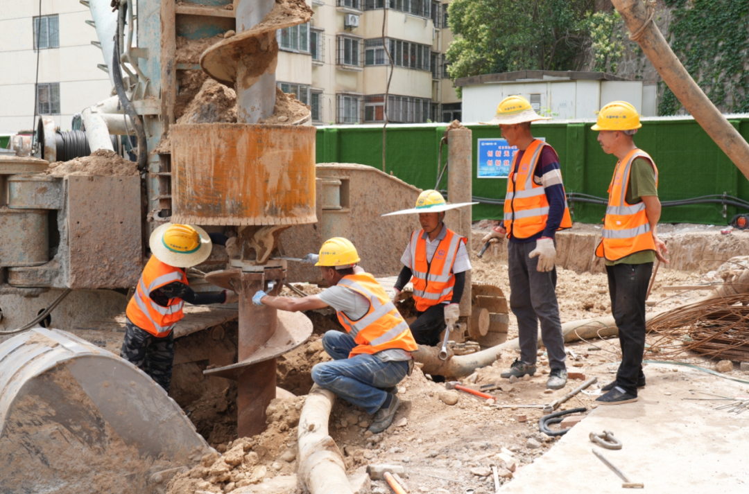 工人对桩机钻杆进行检修