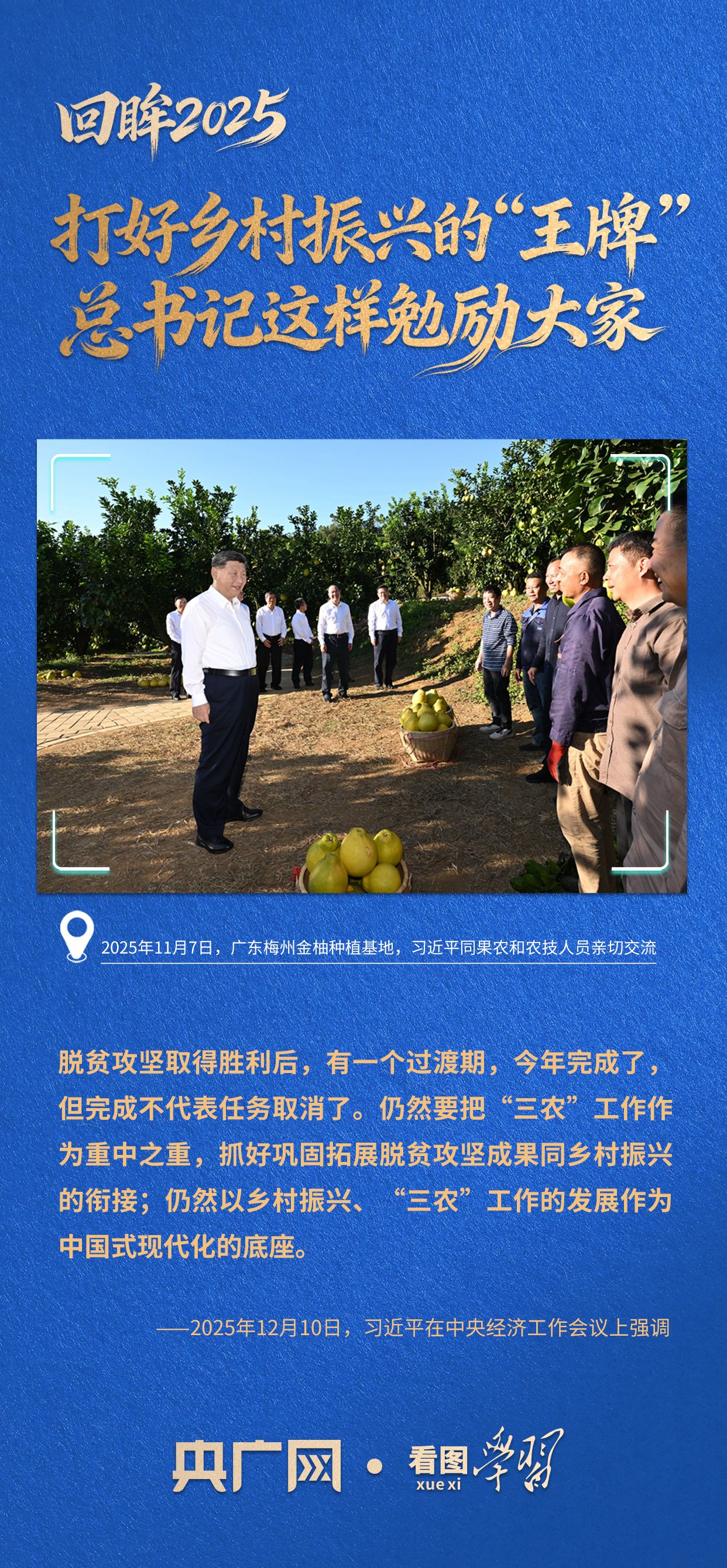 11月,在广东,总书记走进金柚果林,叮嘱要加强科技应用,推动农文旅融合,不断延伸产业链、增加附加值。