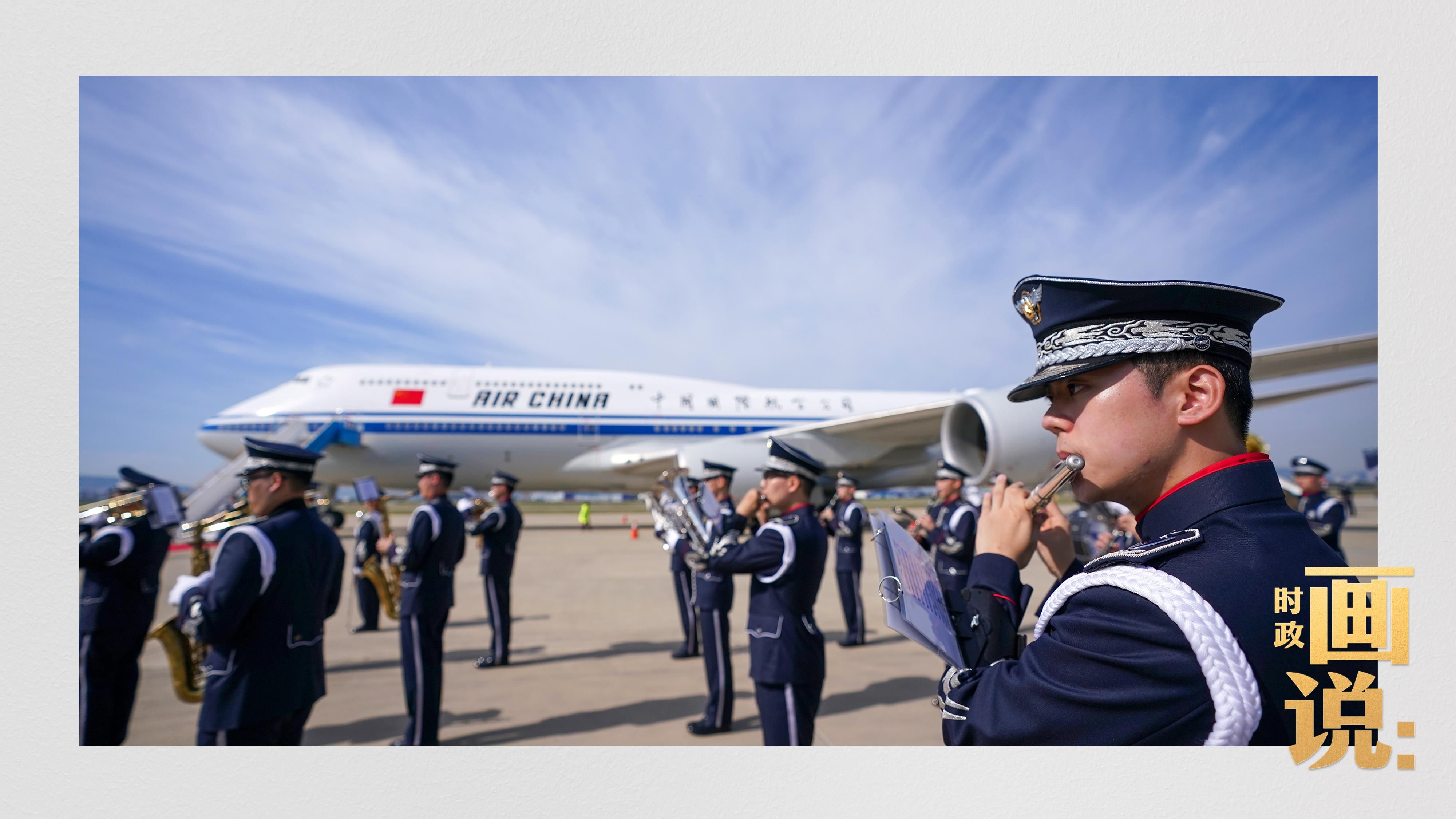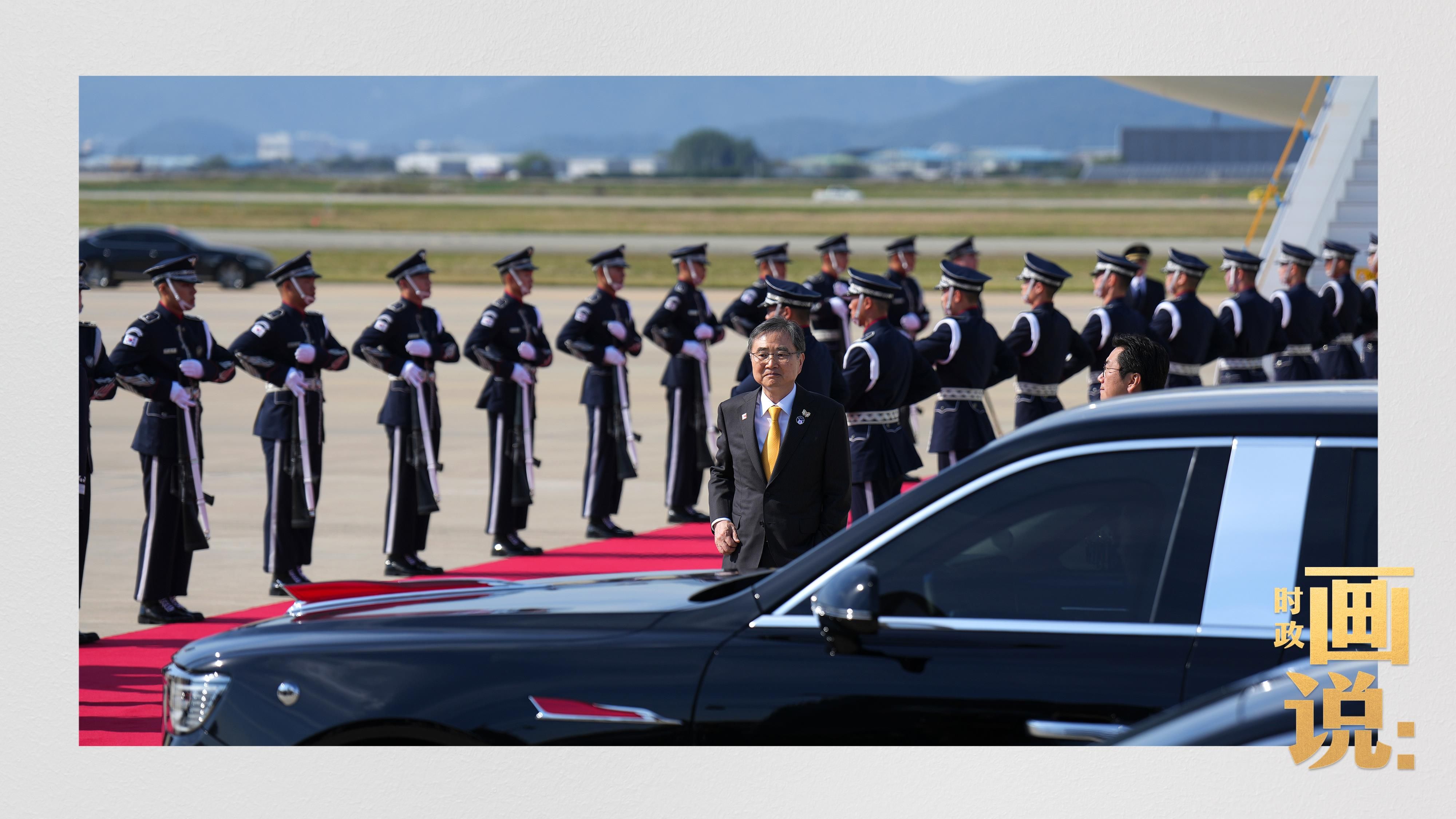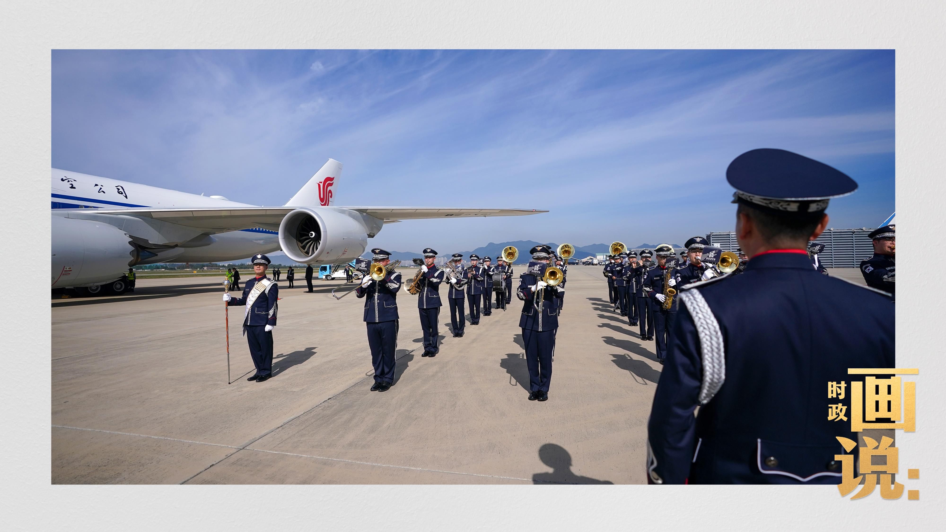 习近平抵达釜山金海国际机场时,韩国外长赵显等高级官员热情迎接。礼兵分列红地毯两侧致敬,军乐团演奏行进乐,机场鸣放21响礼炮。