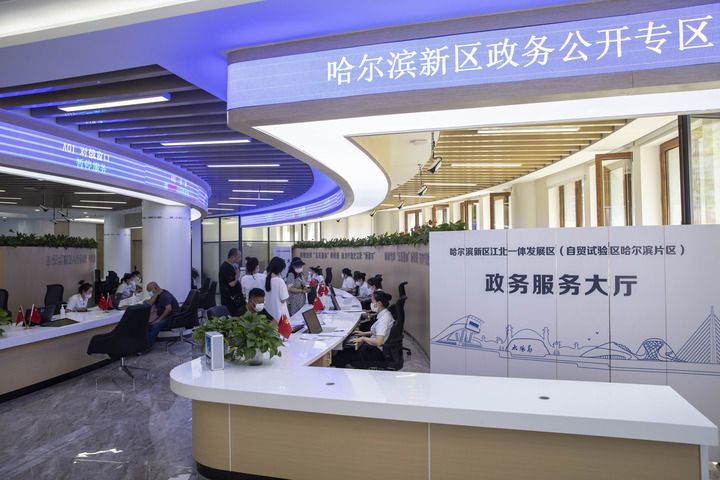 2022年7月12日,市民在黑龙江省哈尔滨新区江北一体发展区(自贸试验区哈尔滨片区)政务服务大厅办理业务。新华社记者 张涛 摄