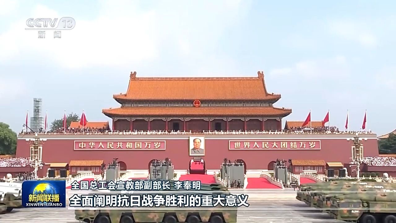 全国总工会宣教部副部长 李奉明:习近平总书记的重要讲话,从全民族、全人类的高度,全面阐明抗日战争胜利的重大意义。庄严宣示中国人民维护世界和平与发展的坚定立场,我们深刻认识到中国共产党的中流砥柱作用是抗日战争胜利的关键。