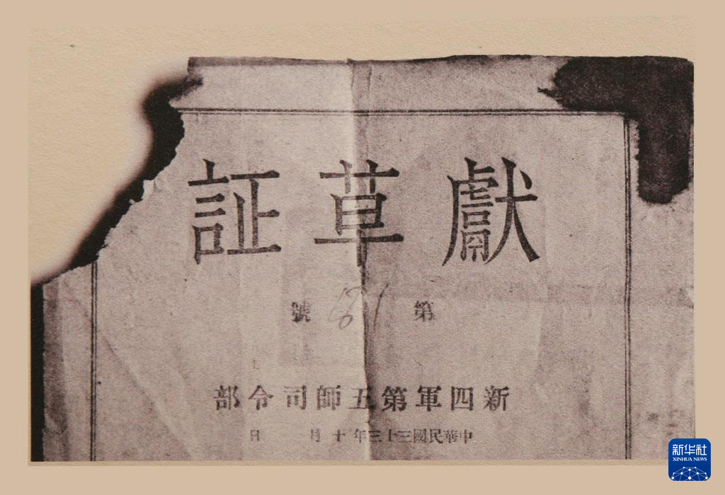 7月21日,在位于湖北省孝感市大悟县芳畈镇白果树湾村的新四军第五师纪念馆内,一张照片引起了记者的注意。照片拍摄的是新四军第五师司令部于1944年10月签发的一张献草证,证书背面写着:“悟峰乡一保八村徐恒照先生,收到你献给部队的稻草30斤,我们十分感谢。今后我全体指战员当用积极抗战,保卫根据地,努力学习,加强生产来报答你们,并在你们农事生产时给你们以最大帮助!”