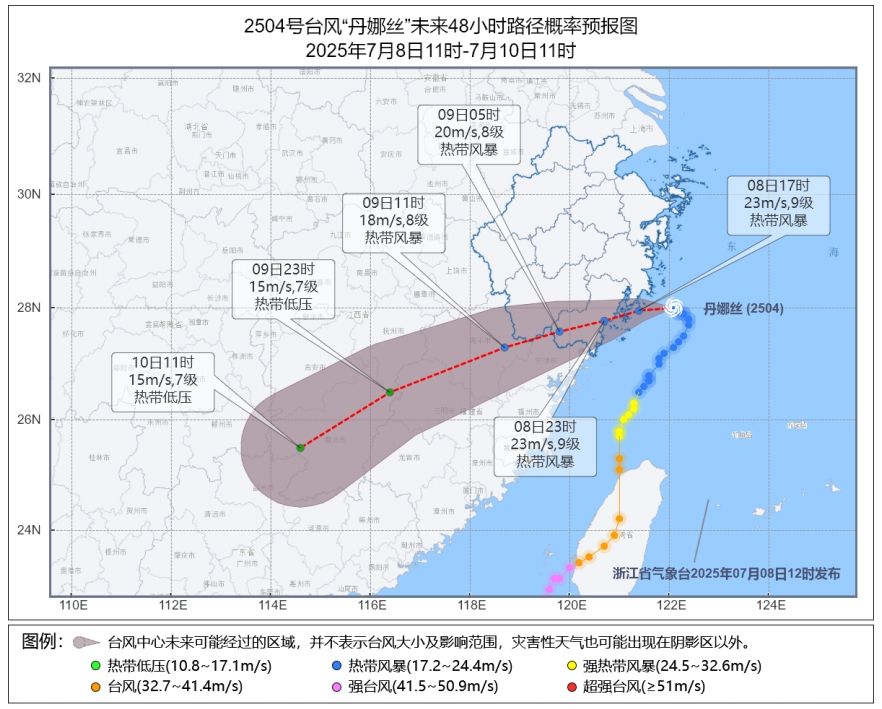 浙江省气象部门预计,台风“丹娜丝”将于今天傍晚到夜间在台州到宁德一带沿海登陆(最大可能在温岭到霞浦),登陆时强度为热带风暴级或强热带风暴级(9~10级,23~28米/秒)。