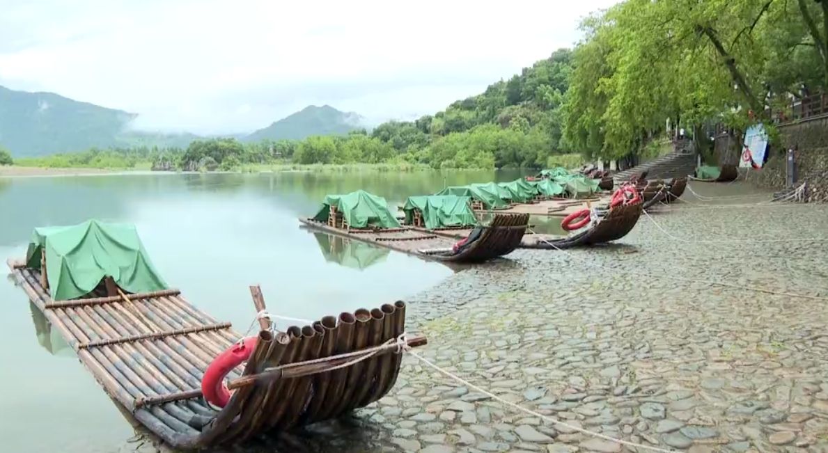 在永嘉县岩头镇狮子岩竹筏漂流点,工作人员正劝游客离开水边,大型竹筏也已经安全转移至避风港内,确保水上设施稳固避风。目前景区加强值班值守力量,严防游客私自进入涉水区域。