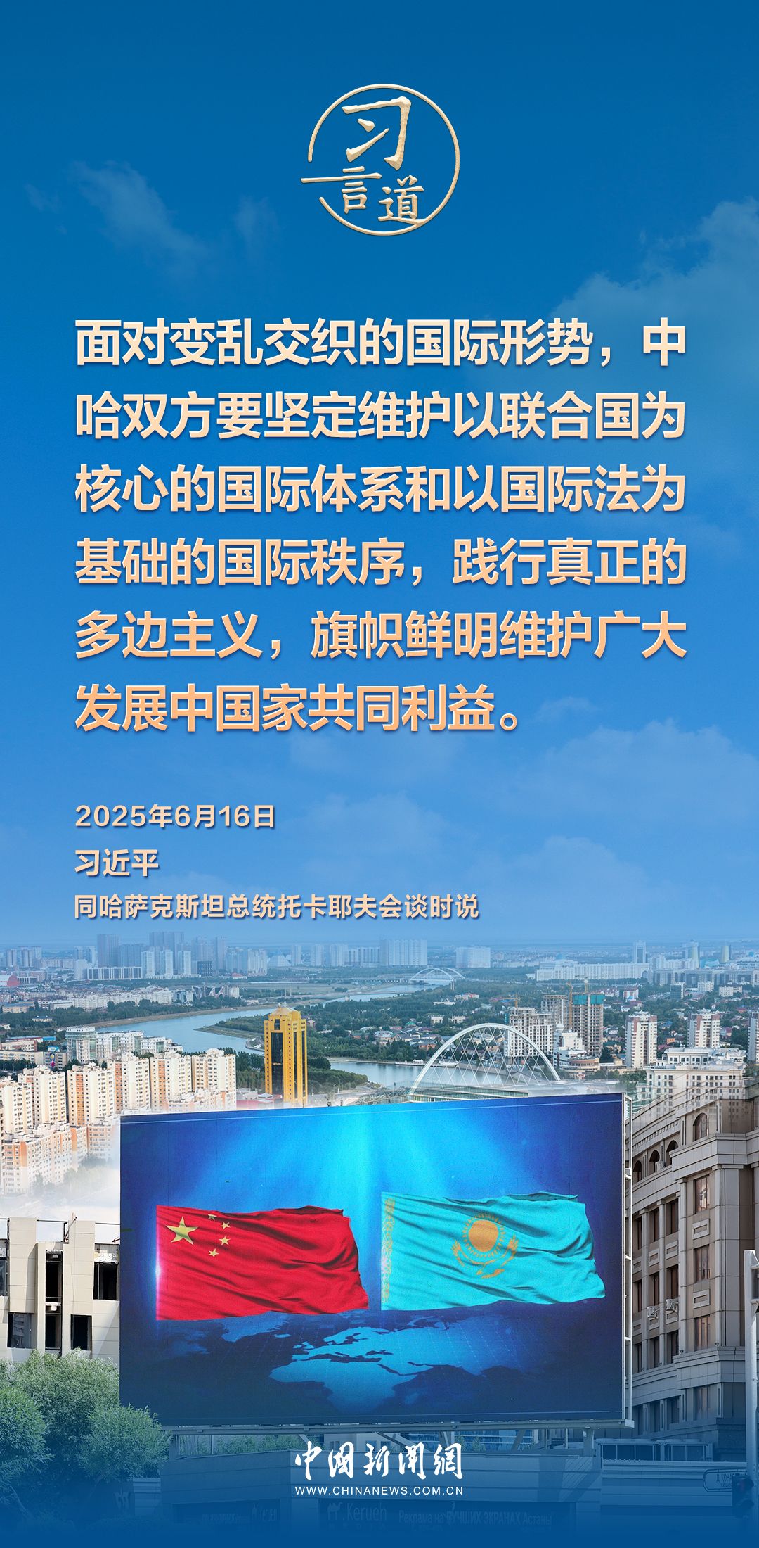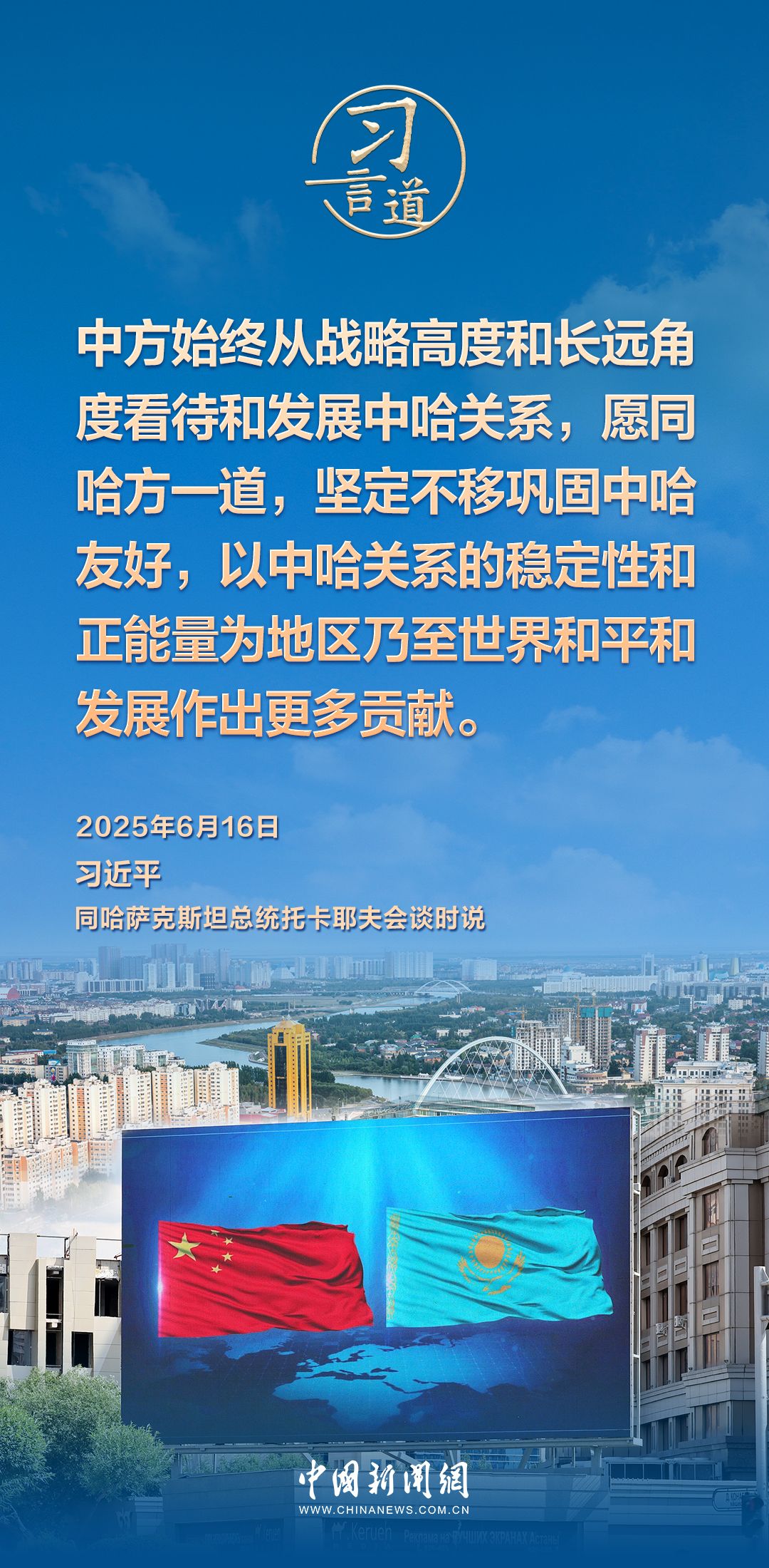 当地时间6月16日,哈萨克斯坦总统托卡耶夫同中国国家主席习近平在阿斯塔纳总统府举行会谈。习近平指出——