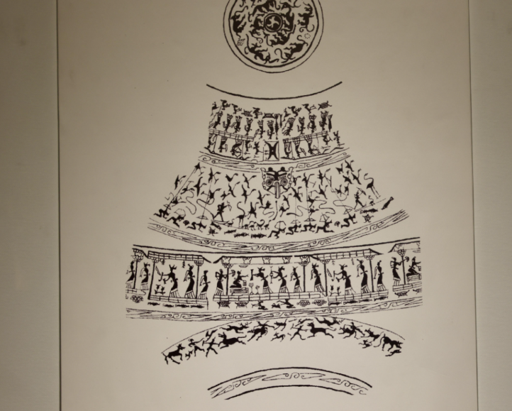 该铜壶上的人物图案实高3.5厘米到4厘米。每组图像有房屋一幢半及9个人物,人物身材修长,婀娜多姿。这是战国时期贵族生活的一幅风俗绘画,也为研究晚周贵族生活习俗提供了宝贵的形象资料。