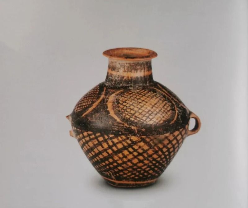 新石器时期马家窑彩陶,该器为泥质橙红陶,小口微侈,窄沿略下卷,细颈、圆肩、鼓腹、平底。腹部有对称的双耳,通器饰黑彩,颈部中间除留一道底色外,全部涂黑,肩部画有四个圆形网纹,下腹饰斜方格网纹,口径9厘米、腹径19厘米、底径8厘米、颈高4.5厘米、高22厘米。从整体上看,该器器形浑圆,颈较长,具有马家窑文化半山类型的一些特点,斜方格网纹也是半山类型彩陶的主要装饰纹样。(来源:“学习强国”陇县融媒号)