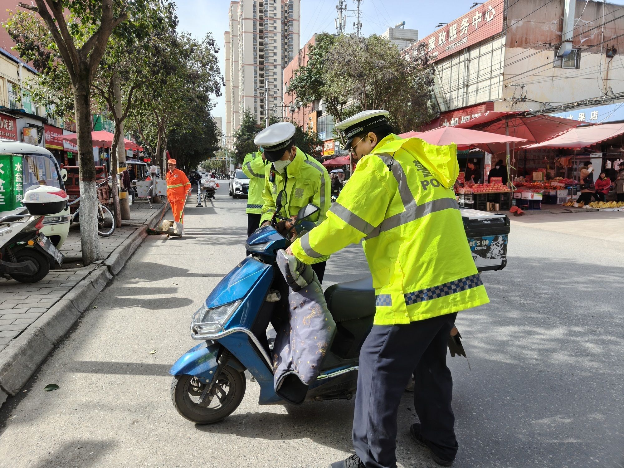 渭滨交警大队机动中队民警正在转移违停电动车。