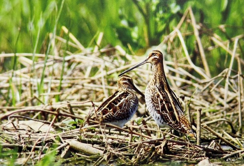 扇尾沙锥[zhuī],鸻[héng]形目鹬[yù]科。头部中央冠纹、眉纹与颊部黄白色;侧冠纹、贯眼纹、颊纹黑褐色;背、肩及翼黄褐色,具黑色及黄白色斑纹;背与肩羽有4条纵向带斑;飞羽暗褐色;腹部及尾下覆羽白色。嘴淡肉红色,端部褐色;脚青绿色。